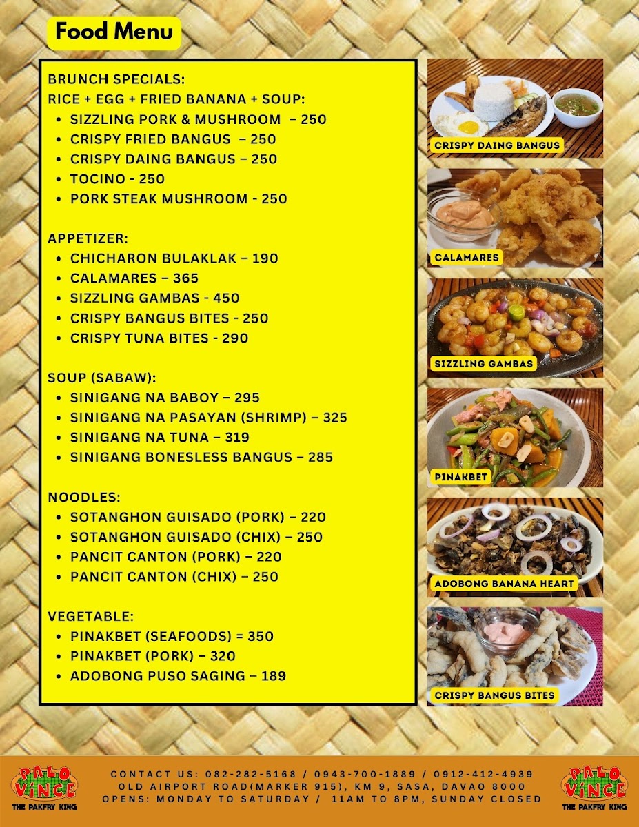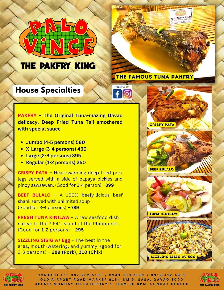 Welcome to Palovince Restaurant - The Pakfry King, a culinary gem located in Davao City. This casual dining establishment specializes in an innovative twist on local cuisine, particularly its famous Pakfry. Derived from the terms paksiw and fry, Pakfry features succulent fried tuna tail cooked in a tantalizing marinade of vinegar and spices. It's a must-try at an unbeatable price of ₱450.